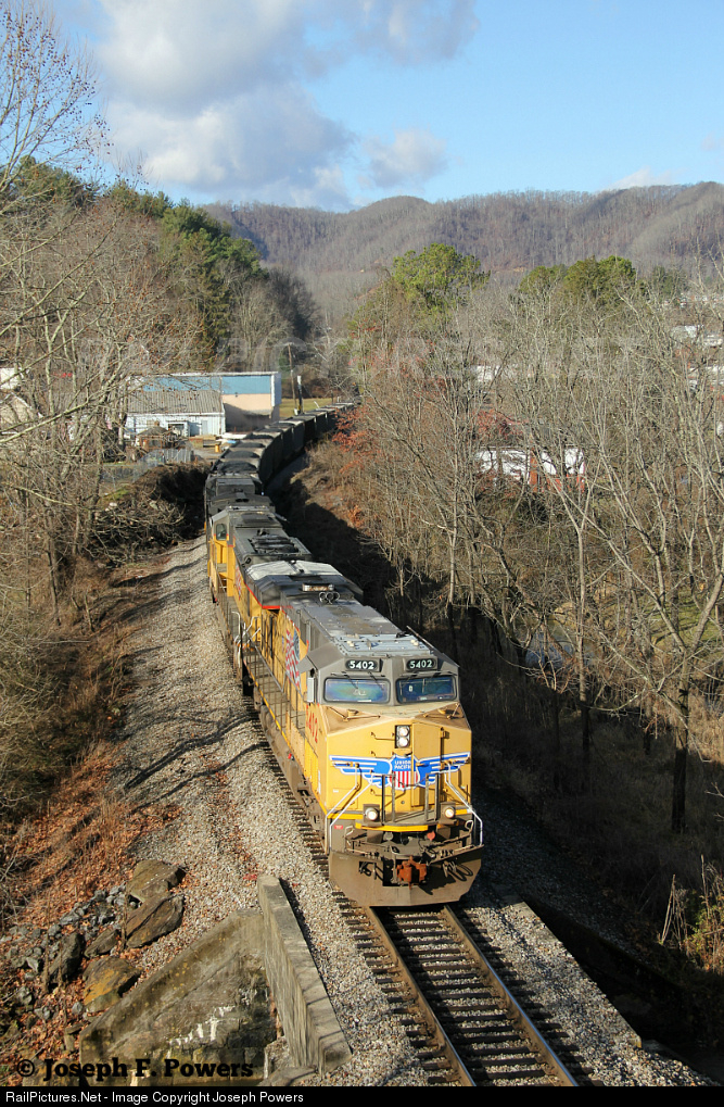 NS U47 rolls east through the town of Coeburn, VA with a loaded coal train. The local mine run crew will take the train to Cleveland, VA where eventually another crew will move the train further east. In addition to the three locomotives (two UP and one NS) on the point, four NS locomotives are shoving on the rear of the train (pusher crew ID unknown).