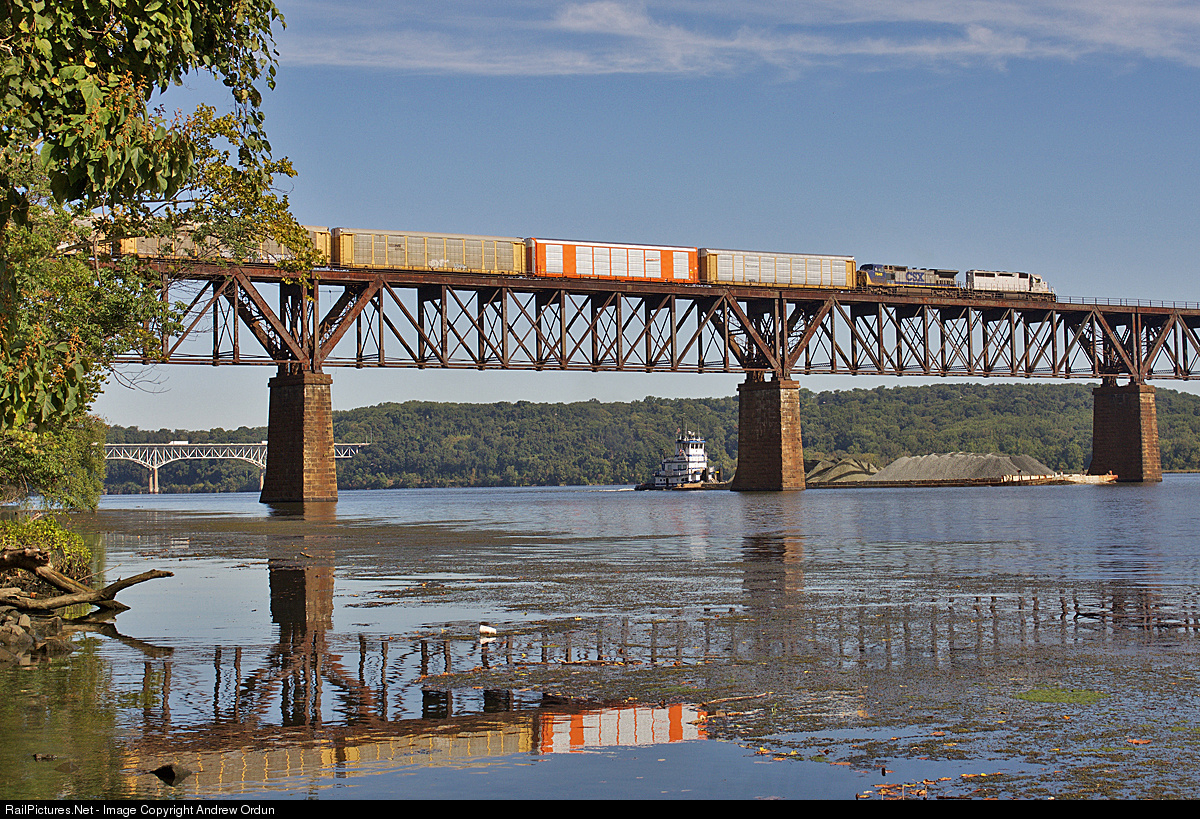 Q216 with a lease unit on the point starts across the Susquehanna River as a tug pushes a loaded aggregate barge down river below.