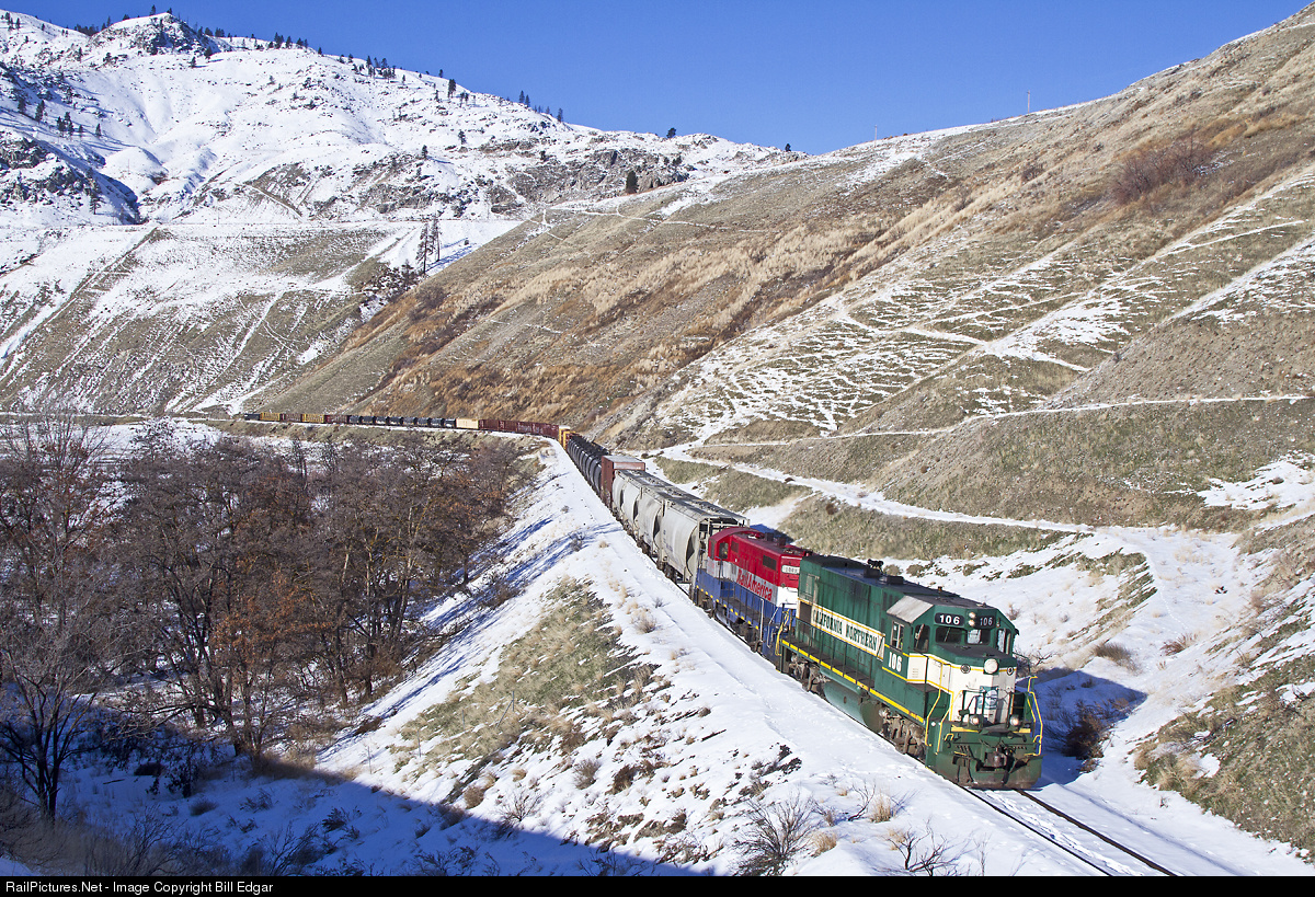 California Northern 106, a former CNW GP15-1 leads a northbound Cascade & Columbia River freight north of Chelan Falls, WA. The train is en route from Wenatchee to Omak, having come down from Omak the previous day.