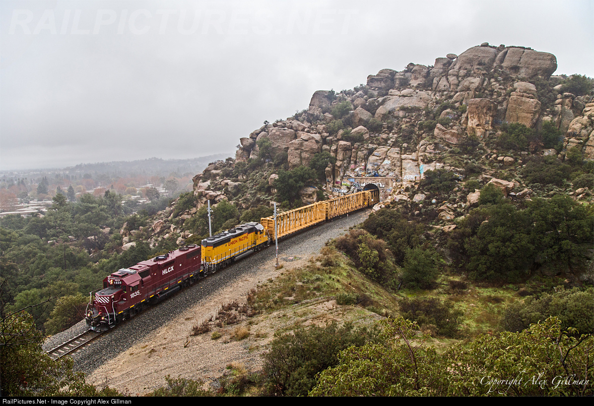 | Exiting the eastern portal of Tunnel 27, a 924-foot long bore through the rocks of Santa Susana Pass, HCLX 1835 leads the morning's run of the LOF41 back to Gemco as seen from a perch that is only worth hiking up to when their is a thick layer of overcast over the San Fernando Valley like today. |