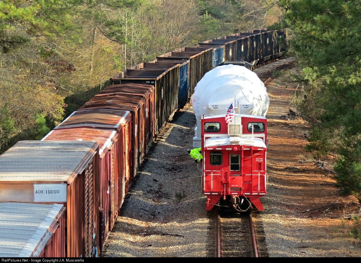 | Running their special turbine move from the Upstate of South Carolina to the Midlands, CSXT W999 slowly walks their train past a string of cars in the siding. One of the crew members of the caboose has his eye carefully on the turbine to make sure they clear each of the stationary railcars. |