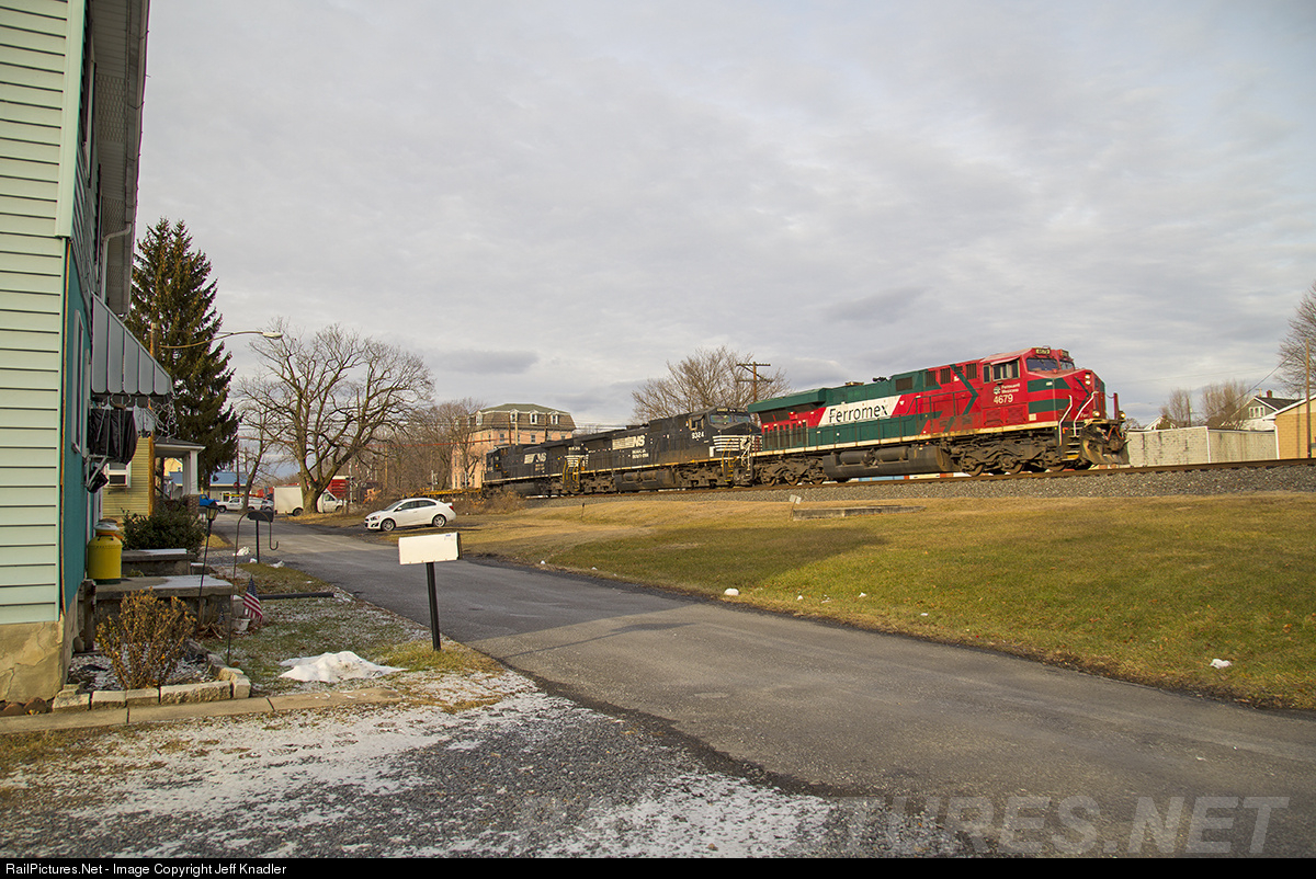 A special visitor leads NS train 36T eastbound on the NS Lehigh Line at Walnutport, PA. The 36T was very late on this day account of numerous incidents plaguing their trip across Penobscot Mountain on the Reading and Northern. Earlier in the day, the 36T stalled coming up the former LV Mountain Cutoff between Dupont and Seidel. After cutting away from their train and sanding the rails ahead, twice, they finally topped the mountain sometime around noon. An 8am Binghamton recrew boarded the train at Seidel and they then continued south. In the vicinity of Rockport, the 36T recrew noticed an issue in their train, which caused them to stop and inspect the head end of consist. A stuck brake was found and the problem remedied. Thankfully, the delays made for an easy early afternoon chase down the valley of the Lehigh River to Allentown.
