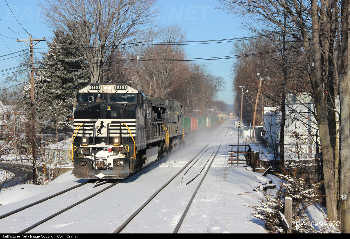 With the wind chill below zero, NS intermodal 22K glides through North Leominster, nearing its ultimate destination of Ayer, MA. The lead locomotive on 22K is sporting an Operation Lifesaver logo in the side in place of the standard Norfolk Southern logo, although you could never tell. In the distance, Pan Am Railways train EDPO can be seen doing yard work in Fitchburg yard.