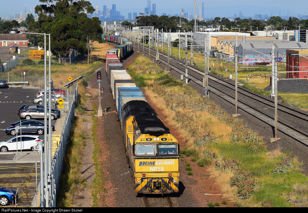 Pacific National's NR58 and AN11 thunders through Williams Landing, Melbourne Victoria with 6MA5, Intermodal Service, bound for Adelaide.... |