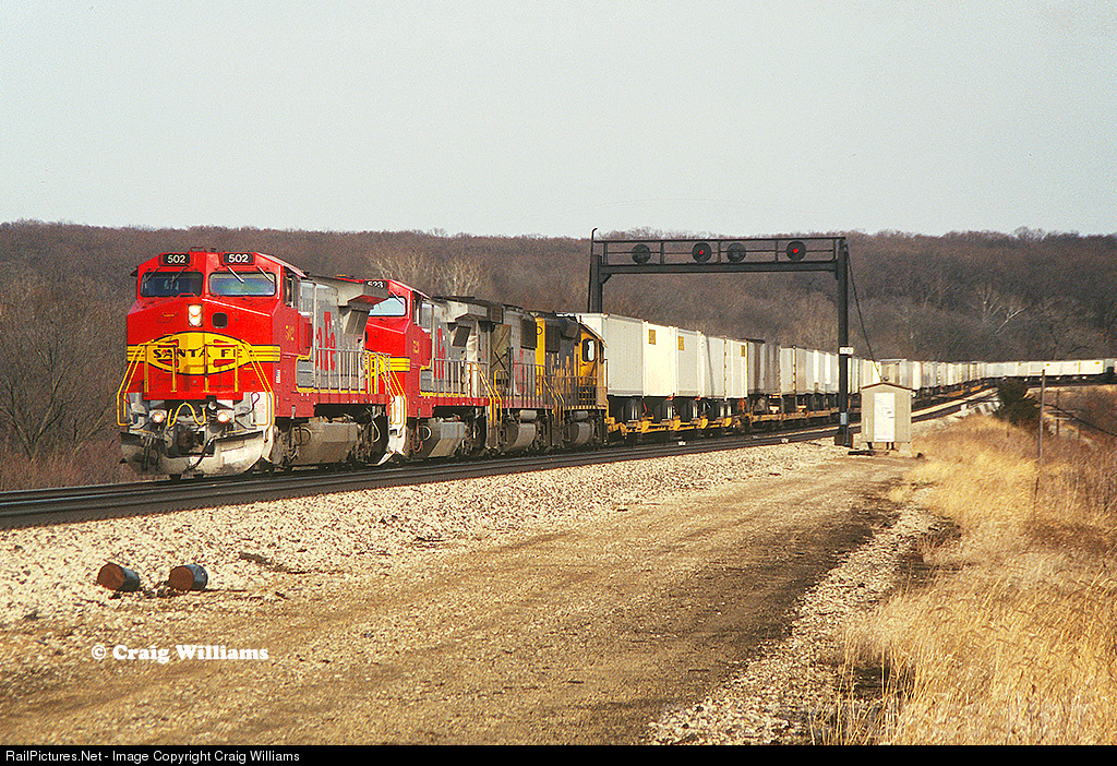 A Q-train from New York, NY, bound from Los Angeles, CA, has just crossed into Missouri. The train is crossing the Des Moines River and just left Iowa. Now the train has about 200 miles to KC. Santa Fe purchased 83 of these B40-8W's from GE starting in October 1990.