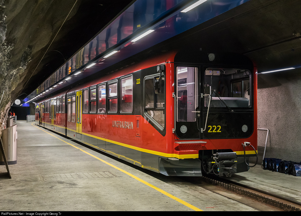 New articulated, partly lowfloor, cogwheel train Bhe 4/8 # 222 of the Jungfraubahn, built by Stadler Rail in 2016, in the highest railway station in Europe, Jungfraujoch on 3454 meter a.s.l. The Jungfraubahn from Kleine Scheidegg via Eigergletscher-Eigerwand-Eismeer to Jungfraujoch was opened in 1912.