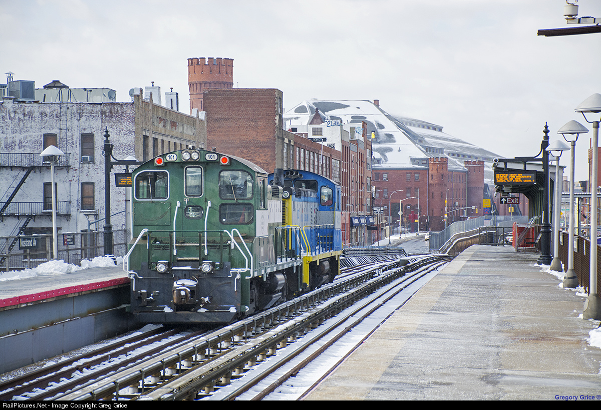 "New York & Atlantic Railway at Nostrand Ave" New York & Atlantic Railway's last SW1001, #101 trails on Long Island Extra 100 as it pasts Nostrand Ave Station on the Atlantic Branch towards VD Yard. LIRR SW1001 #100 is leading the way. The power was used to assist crews during the rerailing of the train that ran into the bumping block at Atlantic Terminal the week prior. This is the first time diesels have traversed the Atlantic Branch in over a decade and the first time NYAR has ever made an appearance on the Atlantic Branch.