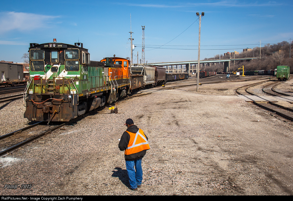 The foreman on BNSF Train Y KCM1911 13I glances at his switch list as the recently relettered GN yard goats drag out a cut of cars to be kicked out. These SW1500's are former Frisco units, working home rails, but were recently restenciled with GN reporting marks in order to clean out a number series for yet another batch of new units on the BNSF Roster.