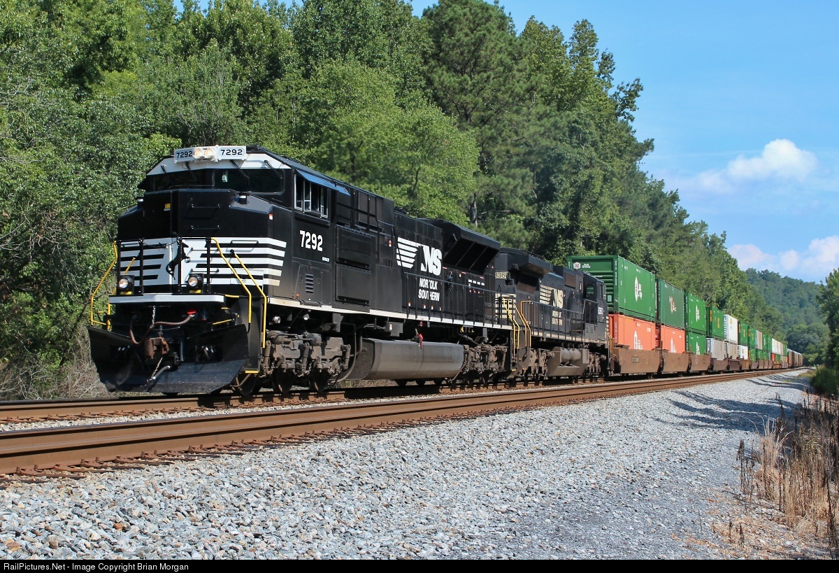 | Fresh NS SD70ACU rebuild #7292 leads southbound Norfolk Southern intermodal train #285 through the Hall Road grade crossing at milepost 85 just south of Lindale, Georgia on NS's Atlanta North District. |