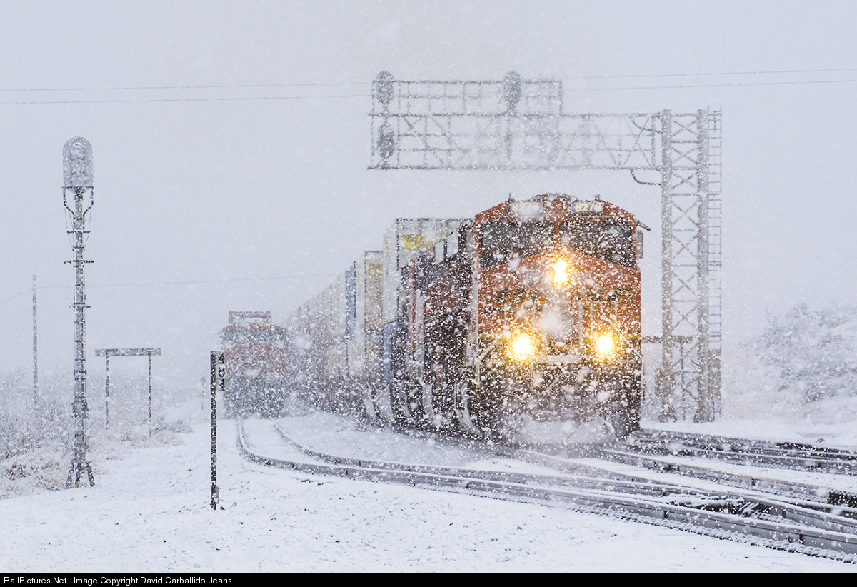 The snow begins fall heavier along Arizona's high country. BNSF 8279 punches its way through the snow in Valentine as a stopped eastbound stack waits in the hole for a new crew.
