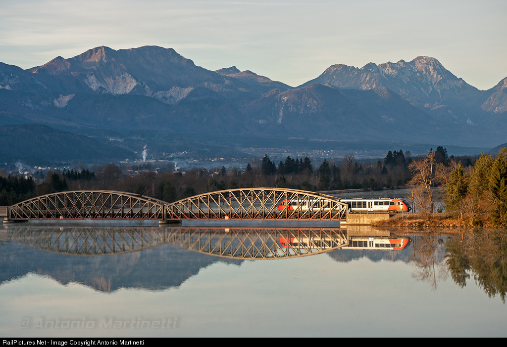 In the early morning freeze, a Desiro DMU passes Drau Viaduct, close to its final destination, Weizelsdorf, as a Klagenfurt S3 service.