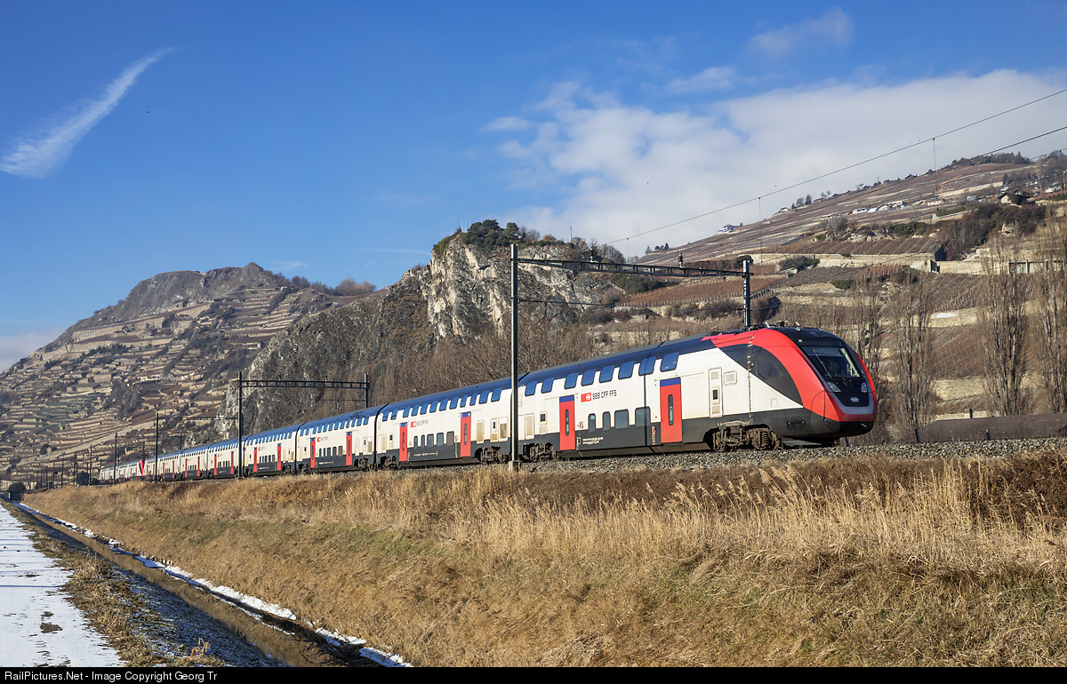 | Pantograph test run of the new Bombardier "Twindexx" double deck train for the SBB between Sierre and Sion, with up to 154 km/h (10 % more then regular on this section). Eight car RABe 502 # 203 and four car RABe 502 # 404, total length 300 meter. |