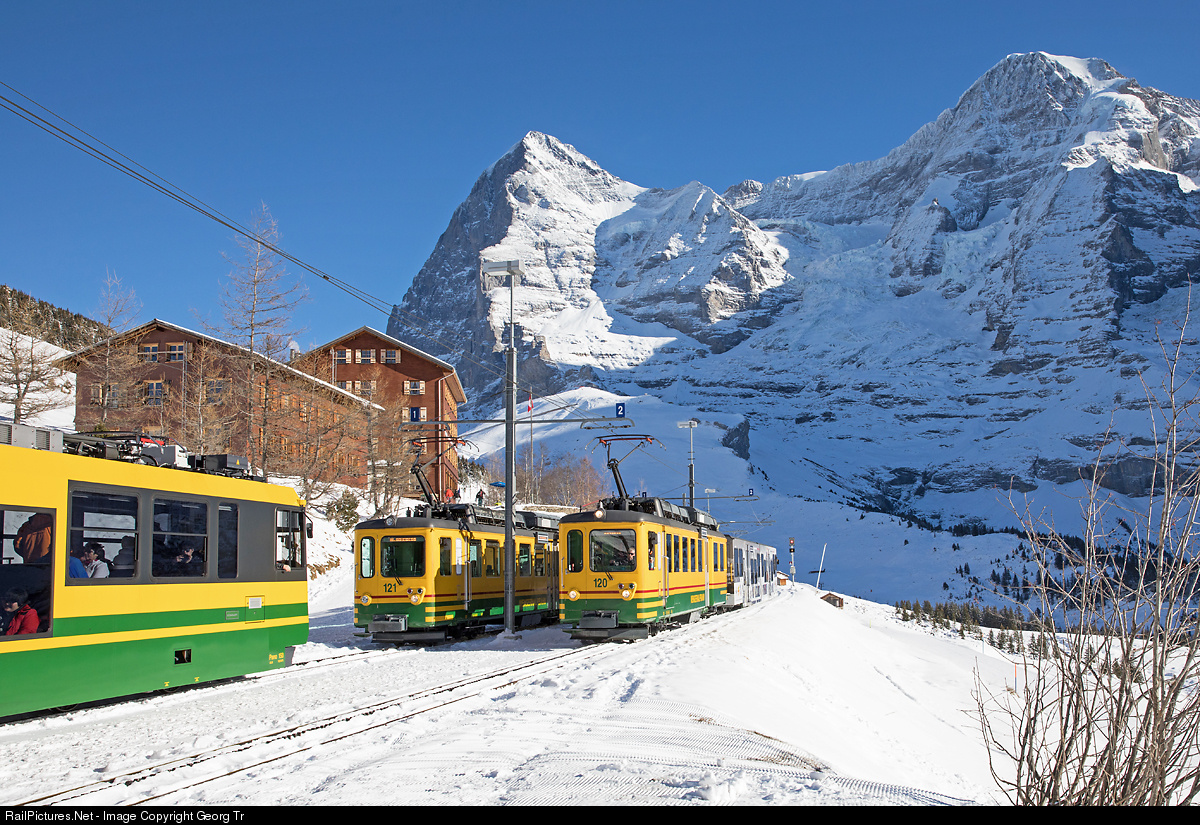 | Wengernalp station with trains to the Kleine Scheidegg (left) and to Wengen-Lauterbrunnen (right). Cogwheel railcars BDhe 4/4 # 121 and 120 from 1970, each with a articulated lowfloor cab car Bt of the 241-244 series. On the left a Bhe 4/8 "Pano" trainset, in the background Eiger and Mönch. |