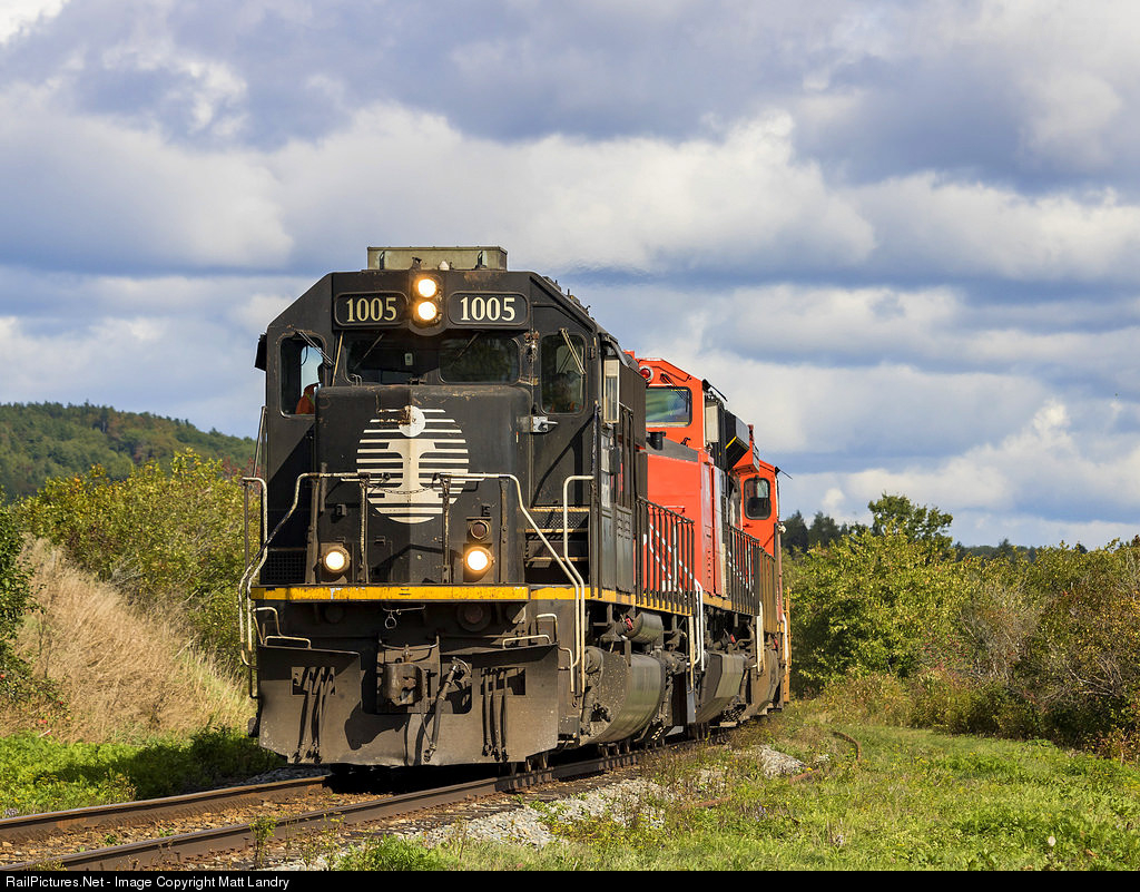 | With a rare leader, IC 1005 leads westbound 406, as they round the bend at Penobsquis, New Brunswick. |