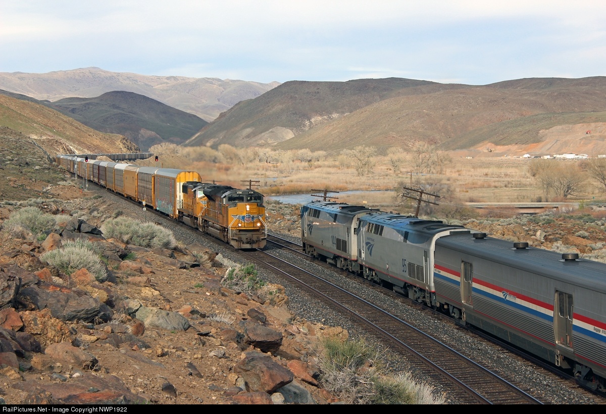 | The ANPMI meets Amtrak Train 6, the eastbound California Zephyr at Hafed, Nevada on a crisp, but nice, March afternoon.