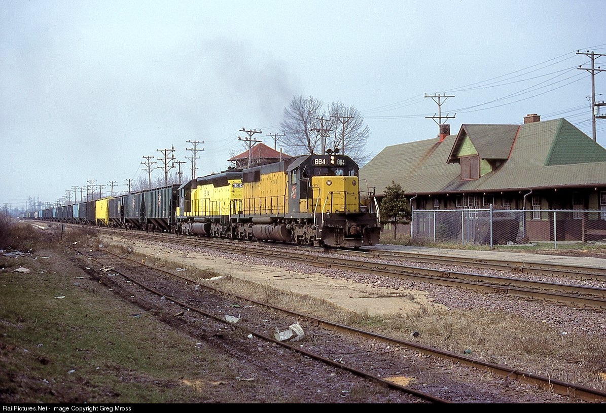 CNW 884 brings a grain train past the Cudahy, WI depot in April of 1986. The train is on the "Old Line", or CNW's ex-passenger mainline. The line still exists, as does the depot (as a historical society).