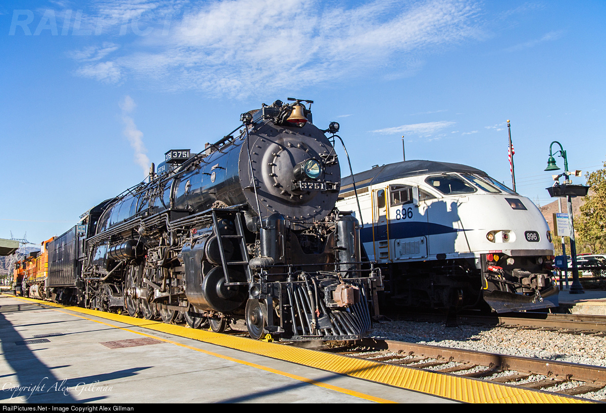 As the morning light spills over the hillsides and onto Acton, Santa Fe 3751 simmers quietly as steam pressure is built in the 1927 Baldwin for the dedication ceremony to officially mark the completion of the new platform at the Acton - Vincent Grade Station. While sitting adjacent to the new platform, the main line is left open to through traffic such as Metrolink 201 seen here pulling in catching the unique shadow of the parked steam locomotive on its nose.