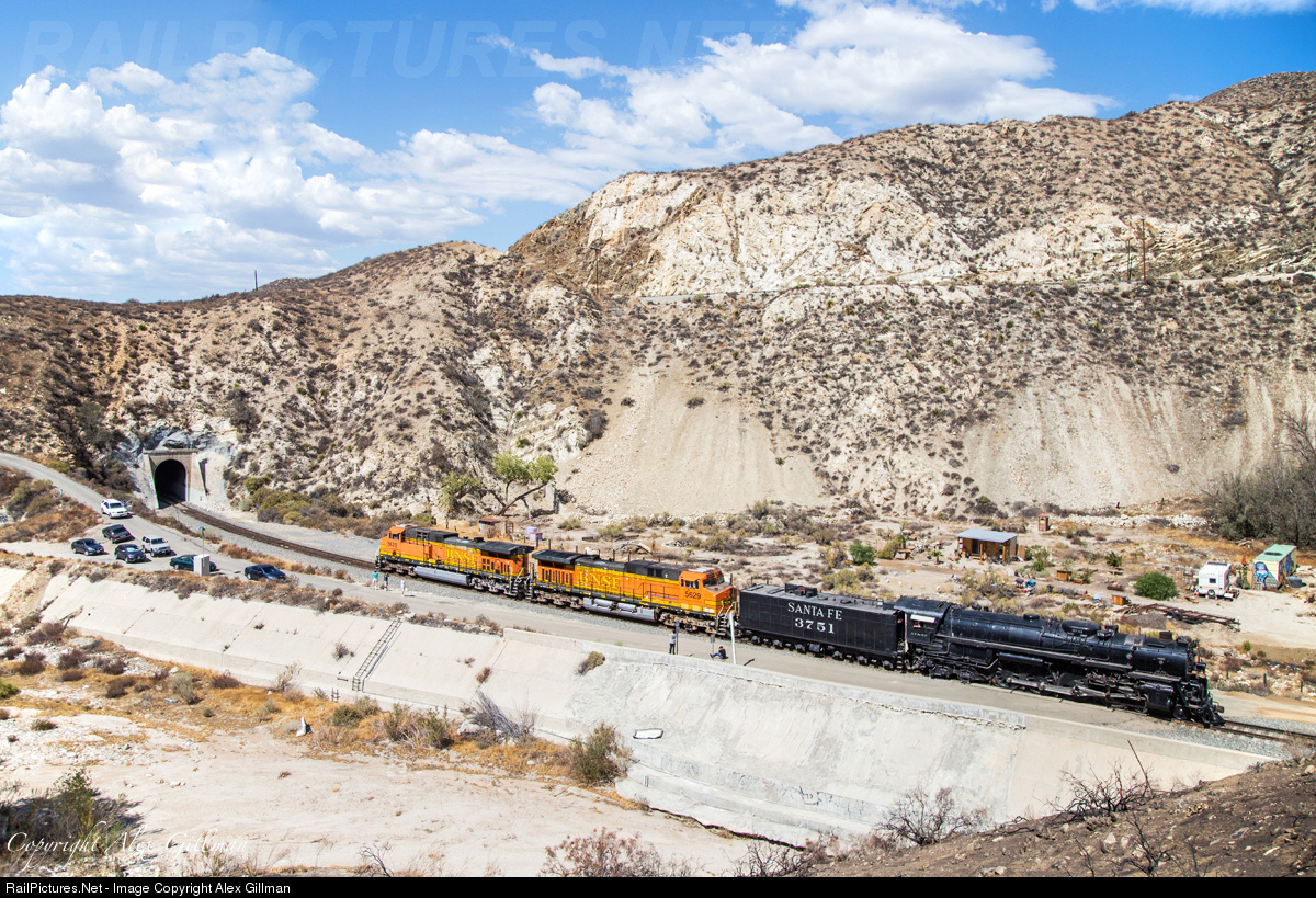 | With the dedication ceremony for Metrolink's new platform at the Acton - Vincent Grade Station complete, Santa Fe 3751 is towed home (under steam) as it is seen approaching Tunnel 19 on its way out of Soledad Canyon. The visit to the canyon for the big Baldwin marks the first time in 24 years a mainline steam locomotive has graced these rails and quiet possibly the locomotive's first time on these rails in its entire career. |