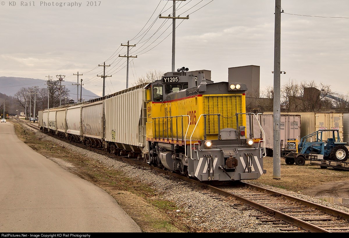 | After leaving the cut of former United States Gypsum Co Hoppers behind in downtown South Pittsgurg, TN, the Sequatchie Valley Railroad (SQVR) 1205 with seven covered hoppers in tow is now heading south on the former NC&StL Dunlap Branch for Sequatchie Valley Railroad Bridgeport Yard in Bridgeport, Ala |