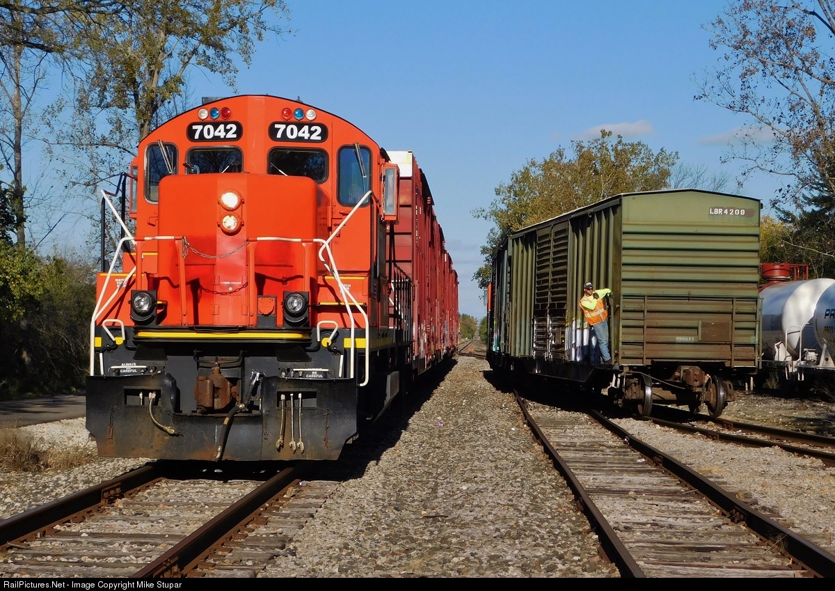 IBCX 7042 and a cut of boxcars for the Columbus Dispatch wait on the main as conductor Brenden Keener protects the shove into Royal Paper.