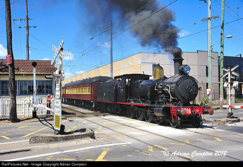 Canberra Museum's restored 30Class 3016T crosses over the Parramatta Road with the 'Children’s Party Express' on the Carlingford Branchline with a return working of the 3801 Limited Tour for Christmas. The Parramatta Road Signal Box is on the left and controls, amongst other safeworking, the heavy traffic flow on this busy road, also referred to the Great Western Highway. The tour travelled the Sydney suburban rail network and arrived at the Rosehill Gardens where passengers, young and old, were treated to a Christmas Party. 3016 was built in 1903 and despite its age has recently been providing the lions share of the motive power required by the museums train movements. Originally a tank loco, it was converted to a tender loco in 1930. It was ultimately returned to service by Museum volunteers in 1989.