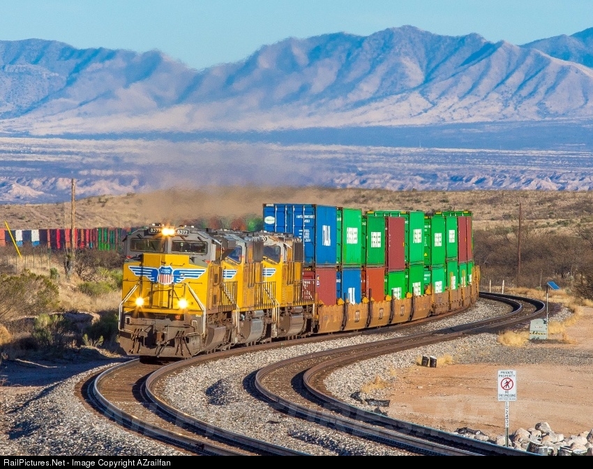 | UP 8377 leading the Dallas (DIT), TX to Long Beach (ICTF), CA intermodal up the 1.65% grade out of Benson, AZ |
