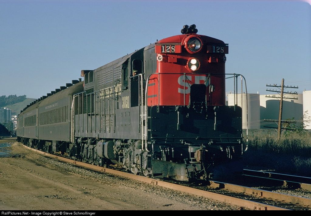 | SP Trainmaster 3031 pauses with San Jose-bound train No. 128 at Bayshore, waiting for trains ahead to clear. The train is made of up exclusively of SP "suburban" coaches. |