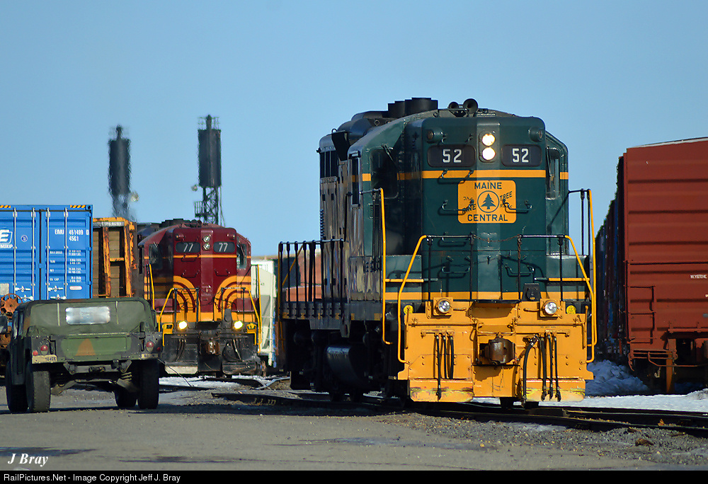 Looking more like a model railroader's dream than a real working railroad, Pan Am Railway's Waterville, Maine yard can often appear fictional. With power from recently-arrived SAPPI-3 in the hole in the distance, GP9 #52 will back up past sister EMD #77 and hook onto the latter's cars to ready them for points West. Out of view to our right, a third GP9, #72, had already gone with #52 to Augusta earlier in the day. Crazy to think it's early 2017, and three active GP9s are working right here with us! Add in the retired Hummer being used by yard crews to throw switches, and we could seriously be in the twilight zone!