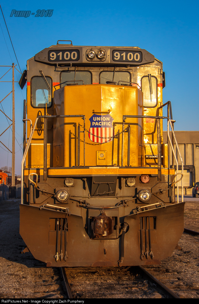 The class UP C40-8, and the first one ever built is seen outside the fence at Mid-America Car. It carries the GE builder number 45549 and was built in November 1987. It's wearing its second coat of UP yellow with the lightning stripe, and was applied in 2005, but it still retains the big factory plow.