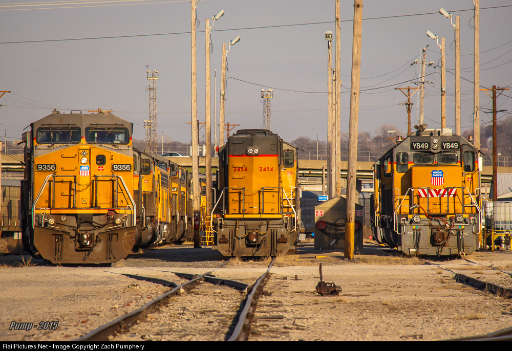 Stored units look forlorn at the UP Armourdale Yard diesel shop. UP has placed a number of Dash-8's and SD60 variants back into storage for the time being. The SD38-2 is here for wheel truing. Also of interest in the line to the left is UP 949 one of UP's E9A's. It had been here for 9 months then!