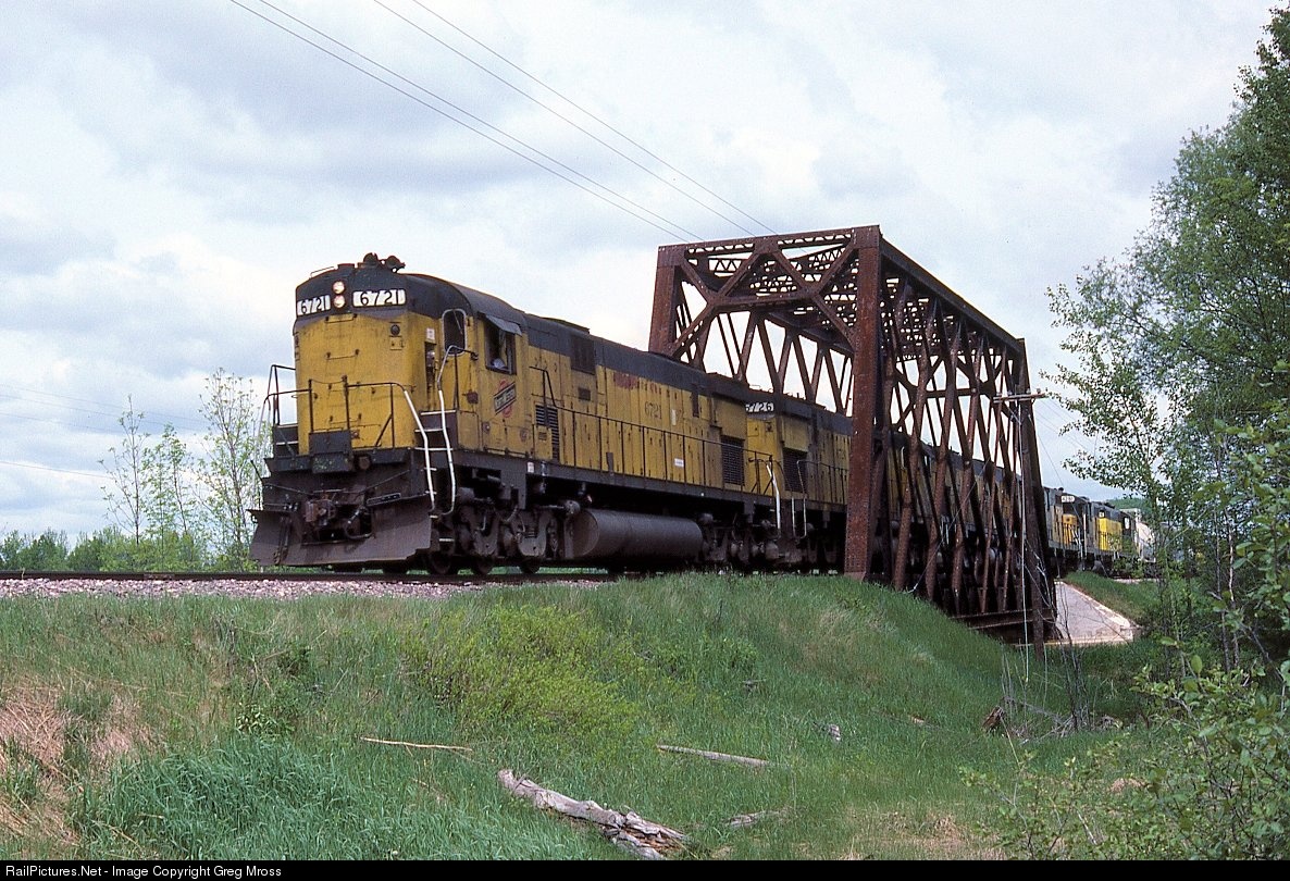 | CNW 6721 crosses the Little Cedar River near Daggett, MI in May of 1986 with a train from Escanaba, MI to Green Bay, WI. |