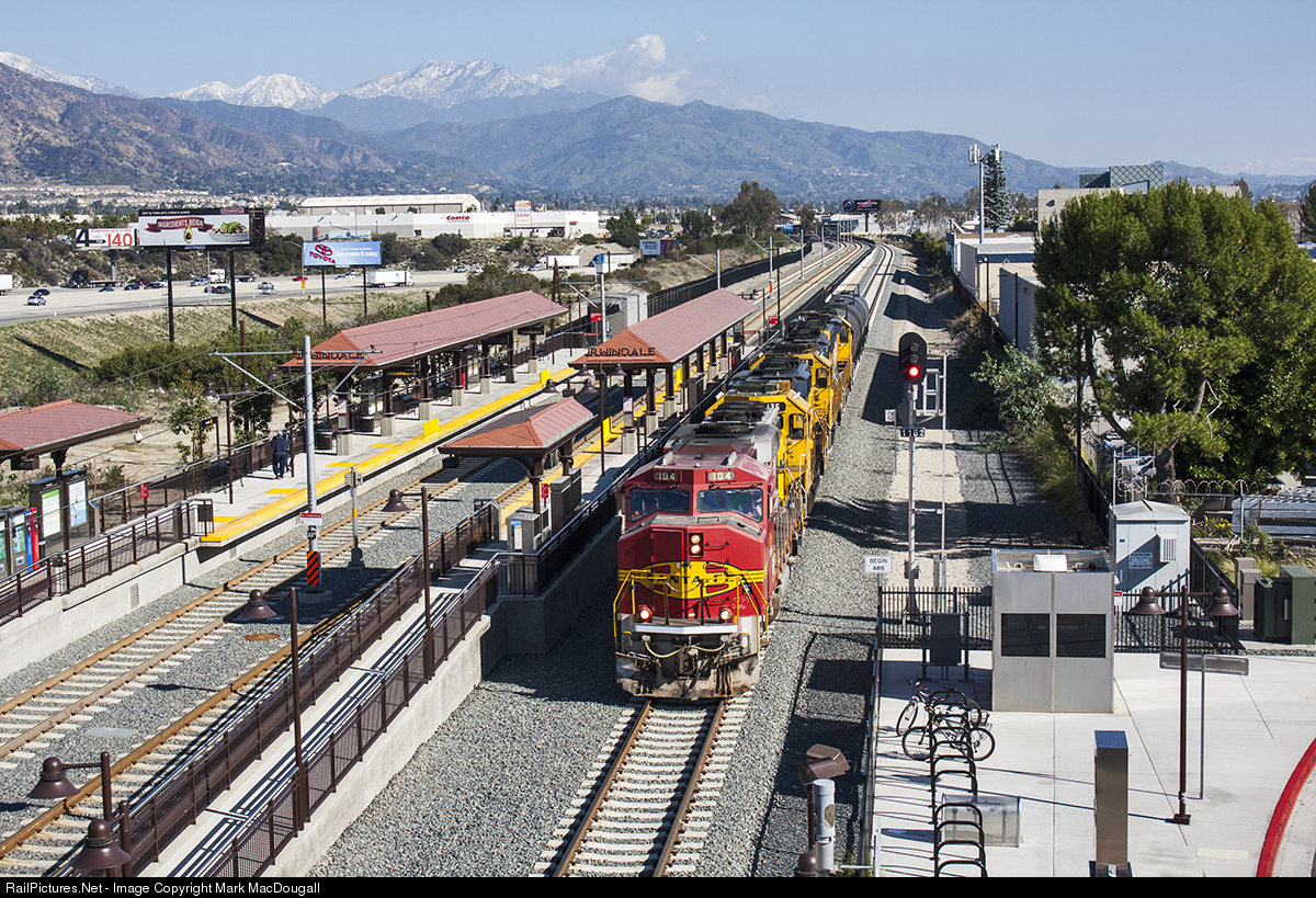 The Pasadena Local passes the LA Metro Gold Line station at Irwindale with a quartet of Santa Fe GP60 variants bound for Miller Brewery, just beyond this station. The snow capped San Gabriel Mountains provide the backdrop.