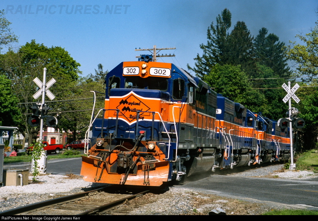 MMID 302 storms thru Highfield, MD and is about to arrive at the CSX interchange where it will swap trains and head back to Union Bridge. MMID 302 is the only one of their units that had the large logo on the front.