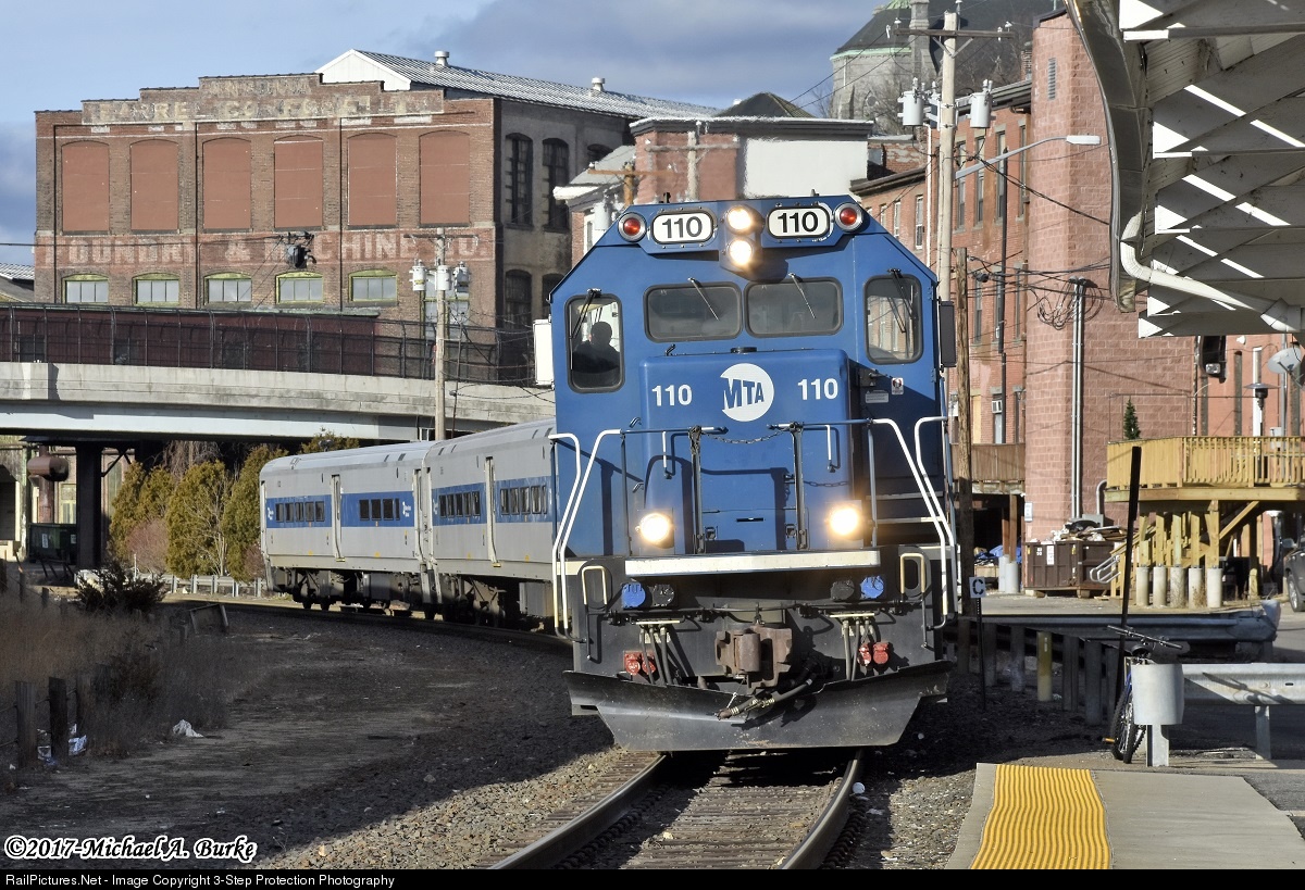 Mini-bomb trains on Metro-North's Waterbury Branch are usually led with the locomotive on the north end. Occasionally, they can be found leading south, opening up a number of photographic locations. On a cool Thursday afternoon, Brookville BL20GH 110 brings train 1971 into Ansonia station. The old Farrel Company factory can be seen in the background, which is in the process of being torn down.
