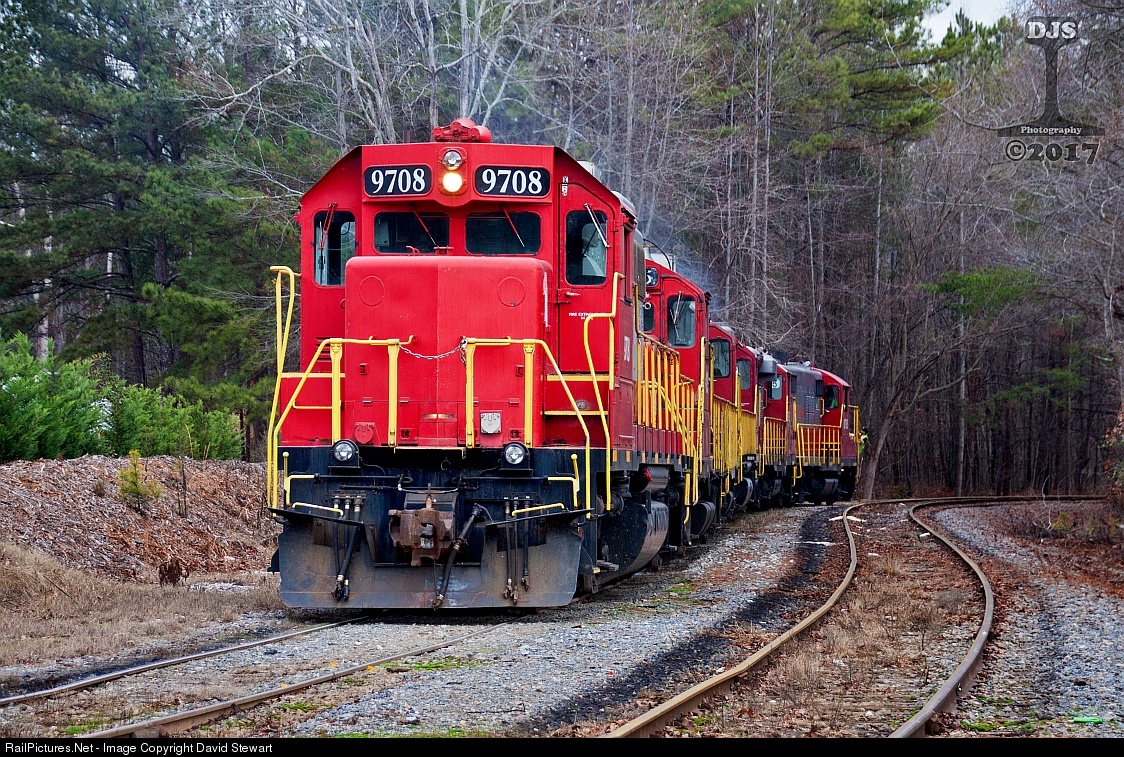 | Georgia Northeastern GP38 9708 is the day's south facing unit for the grain train, 9708 is noted for having the extend cab feature from it's time as a Penn Central ordered unit with dual controls. In this view, the grain train's power drifts north at Pilgrim's Pride Canton, Georgia location before doubling back for another move. |