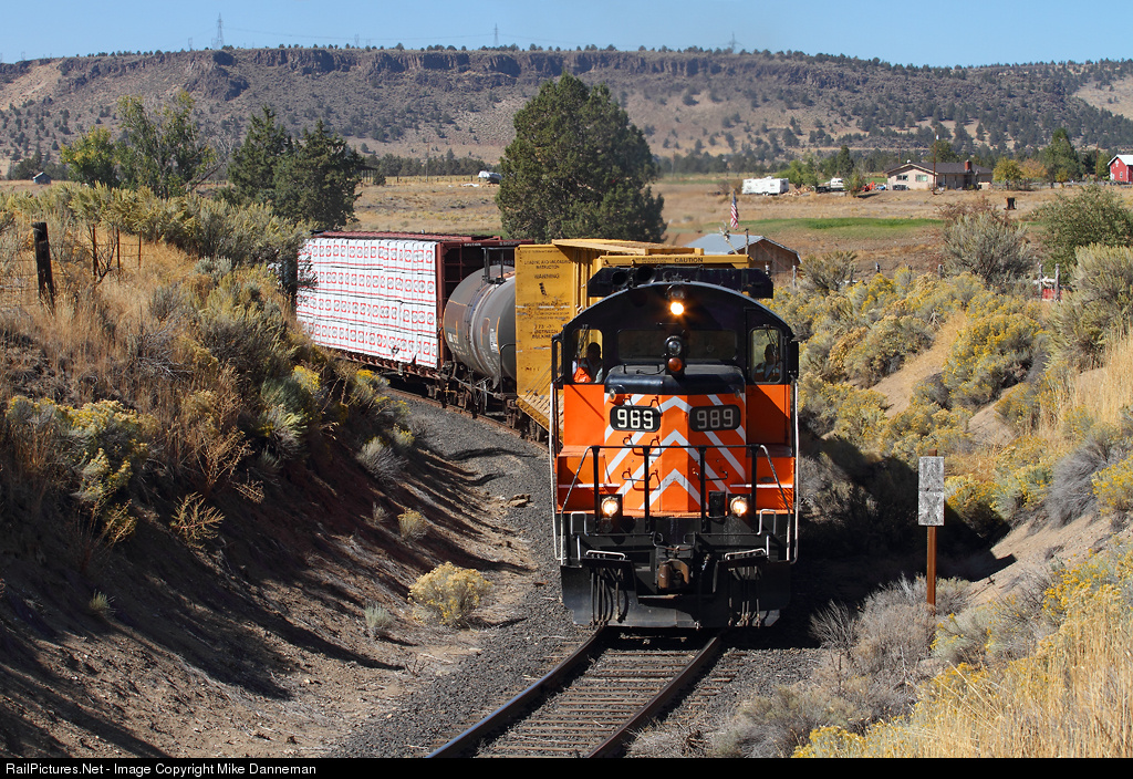 An eastbound City of Prineville train passes through a cut along Elliot Lane west of Prineville, on its trip east from the BNSF connection at Prineville Junction near Redmond, Oregon, on September 28, 2016. The short train is powered by No. 989, a former Milwaukee Road GP9 rebuilt by Milwaukee and now labeled a GP20.