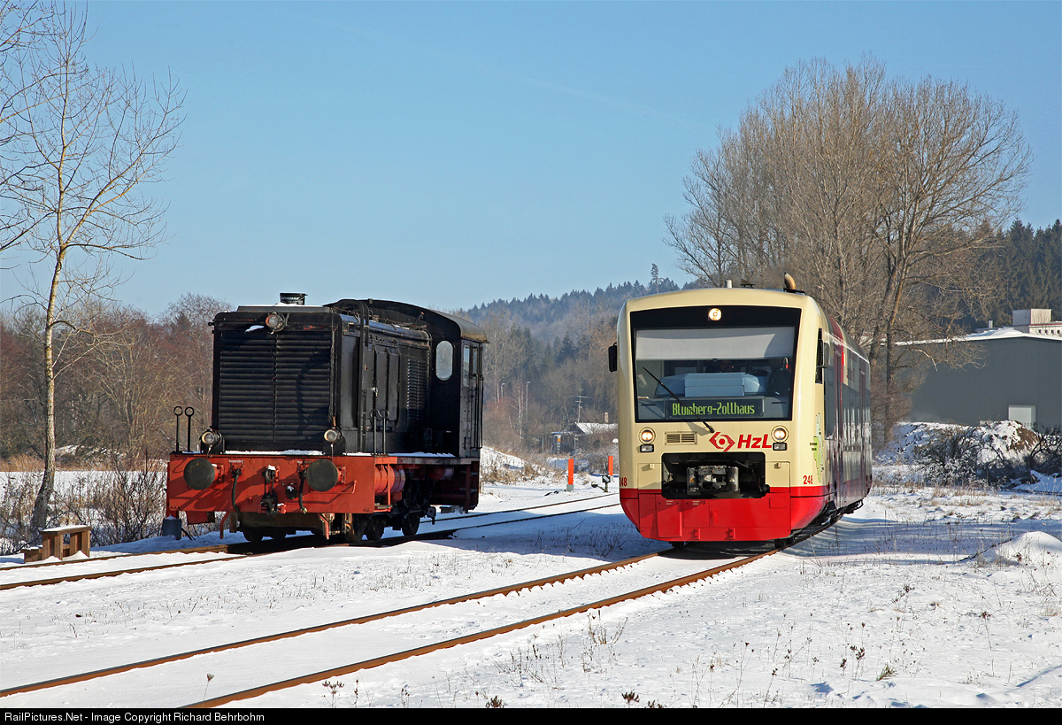 | A railcar of the Hohenzollerische Landesbahn (HzL), coming from Immendingen, arrives in the terminal station Zollhaus-Blumberg. The Regioshuttle 248 (built in 2003 by Stadler Pankow) meets V 36 119 of the heritage railway Sauschwänzlebahn. This locomotive was constructed in 1940 by Berliner Maschinenbau AG (BMAG). |