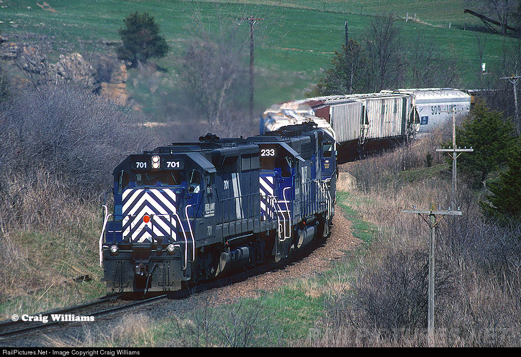 | A westbound freight train out of Marquette snakes up grade to Monona. The 13 mile climb was tough pull for westbounds to get out of the Mississippi River Valley. The train is bound for Mason City on the IMRL 4th Sub. Leading today's train is 1 of 4 SD35's the IMRL (701-703 and 705) had leased from the MRL from start up until May 1999. The IMRL returned these units to the MRL since they were not as compatible with other power on the roster. The 701 was built in 1965 as the Norfolk and Western 1566. |