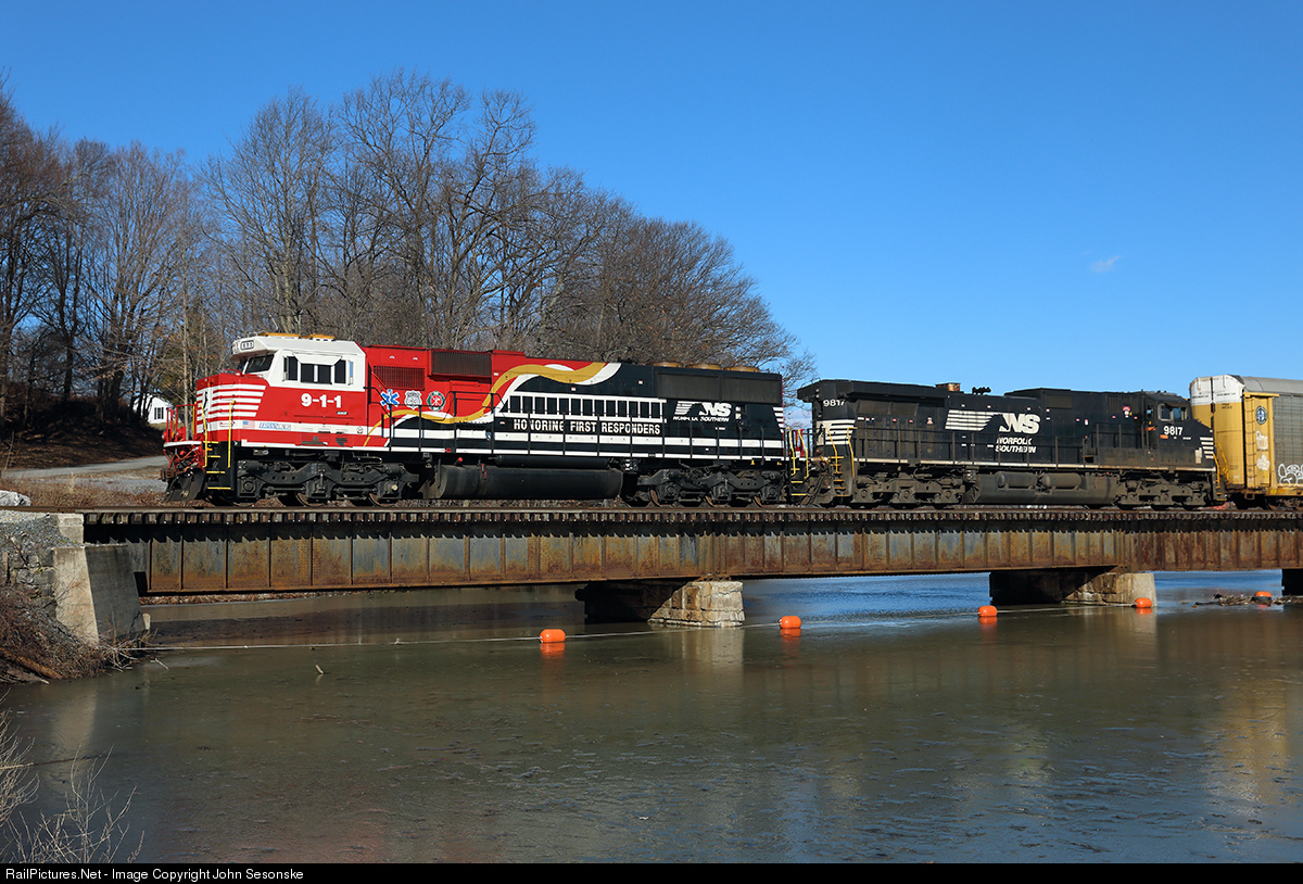On a lucky Friday the 13th the NS First Responders unit crosses the Hoosic River on the former Boston & Maine. It is leading a short empty autorack train WB towards it's NS connection at Mechanicville, NY. The nose paint is reminiscent of the B&M's bicentennial unit's nose.