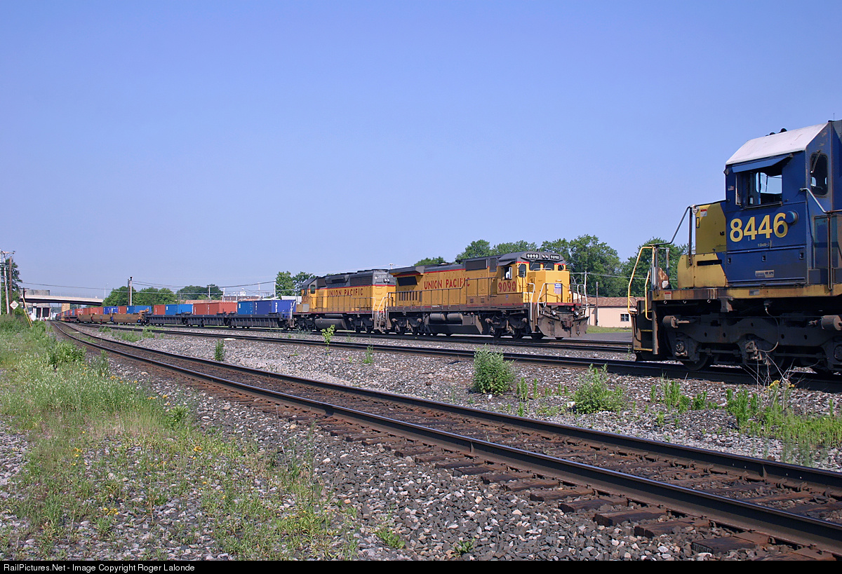 Union Pacific GE C40-8 No.9090 (Ex-CNW 8549), SD40-2 No.3037 (Ex-CNW 6872) with CSX SD40-2 8446 at Syracuse, New York June 27, 2005.