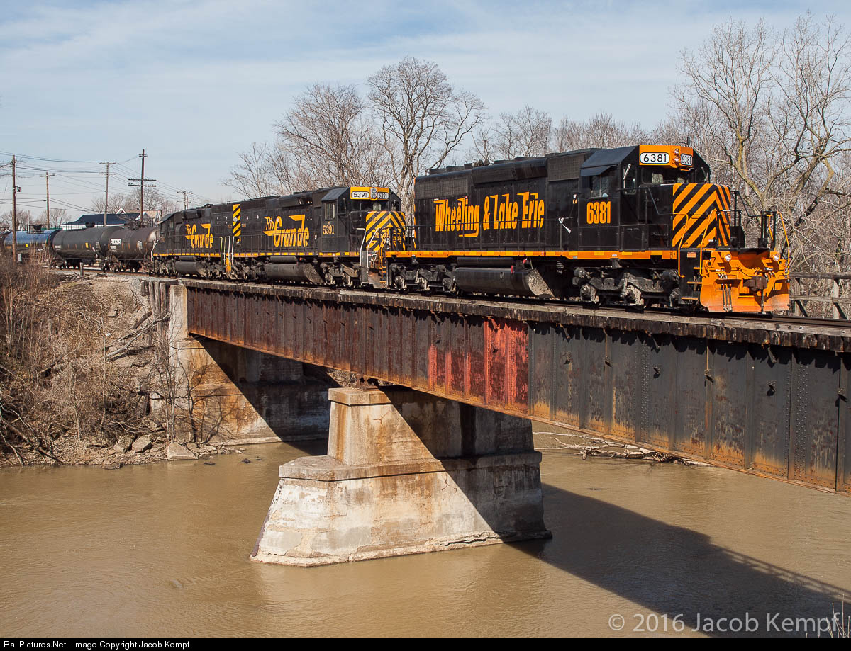 | Eastbound Wheeling & Lake Erie train 228 crosses the Huron River in Monroeville, OH on its way from Bellevue to Brewster. A Wheeling SD40-3 leads a pair of former DRGW 'Tunnel Motors'. In addition to the 5391 and the 5413, Wheeling owns a third tunnel motor numbered 8795. |