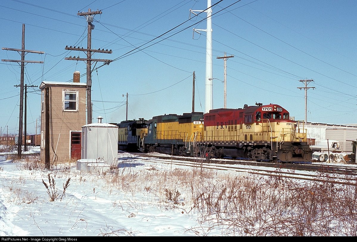 FRVR 1702 passes Broadway Tower in Green Bay, WI as it departs the CNW yard for Butler, WI in December of 1992. Broadway Tower has to rank right up there as one of the smallest 2 story towers in the USA.