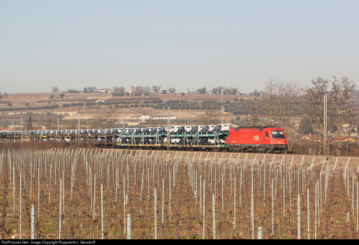 | a rare sight is a OBB 1216 leading a freight Train in Italy. Here, we see 1216 032 with a autorack full of new Volkswagen's rolling through the vineyards just North of Verona. |