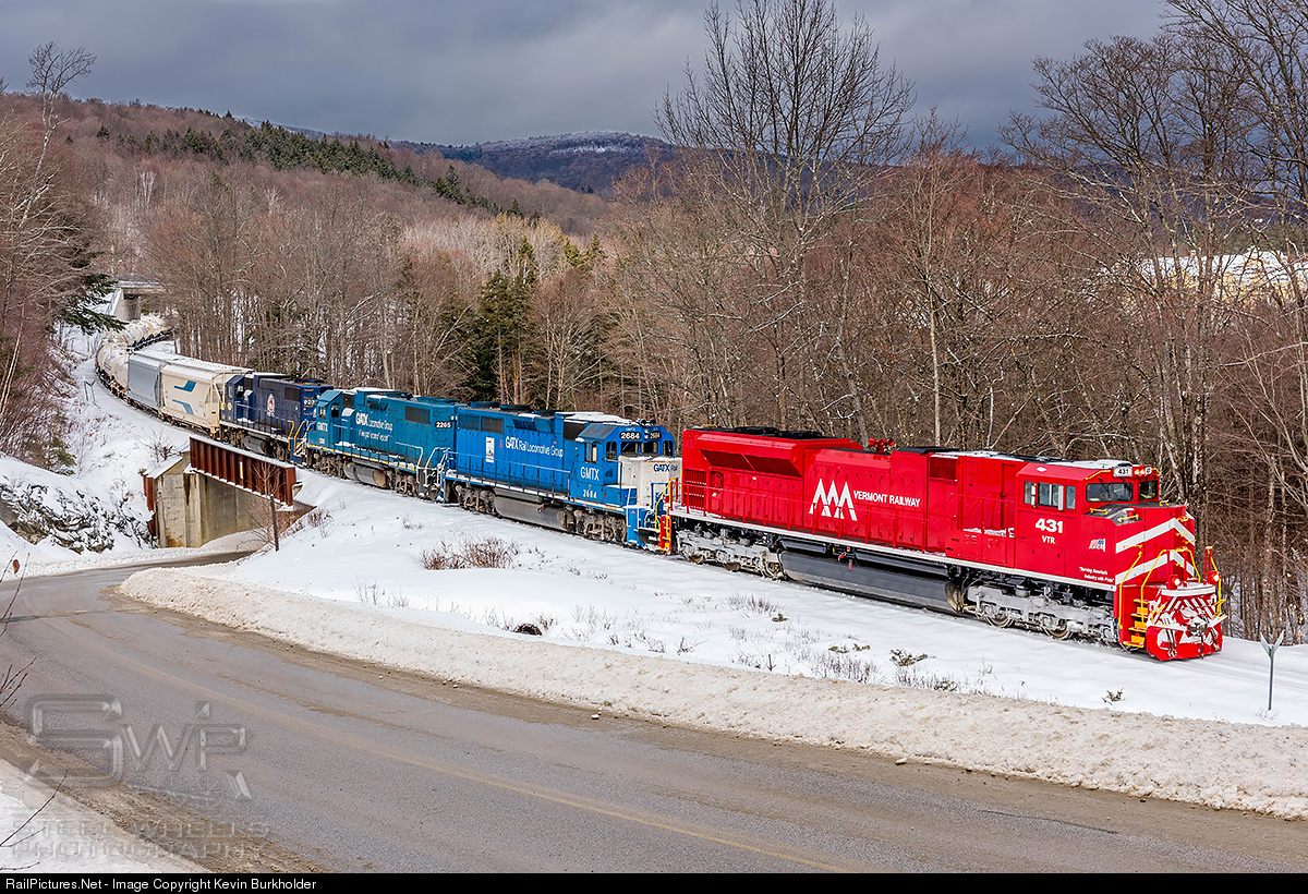 | Following the latest round of heavy snowfall in the Green Mountain State, Vermont Rail System's Green Mountain Railroad train #263 is seen downgrade through the Okemo Ski Resort at Ludlow, VT with VTR SD70M-2 431 leading GMTX GP38-2 (ex-GP40) 2684, GMTX GP38-2 2205 and VTR GP38-2 202. |
