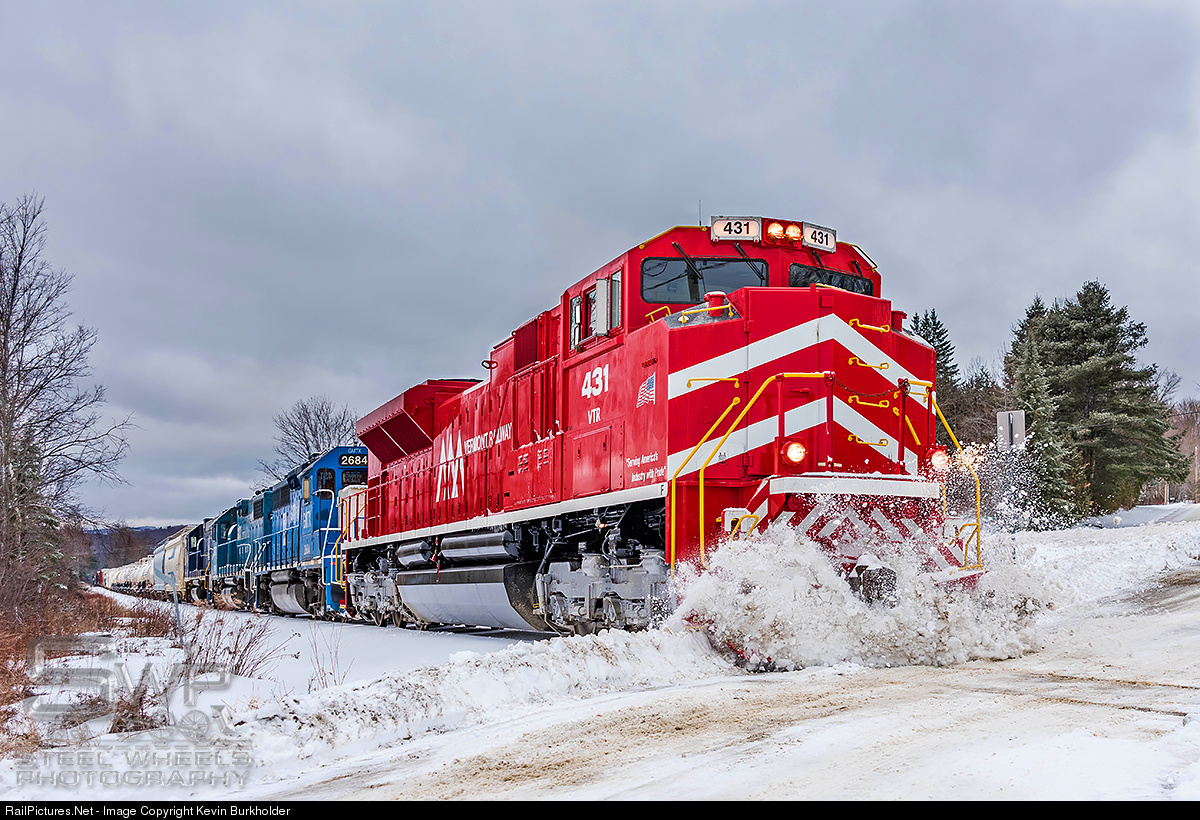 | Vermont Rail System's Green Mountain Railroad train #263 is seen making light work of snow piles left by plows after the latest Nor'easter at Mt. Holly, VT with VTR SD70M-2 431 leading GMTX GP38-2 (ex-GP40) 2684, GMTX GP38-2 2205 and VTR GP38-2 202. |