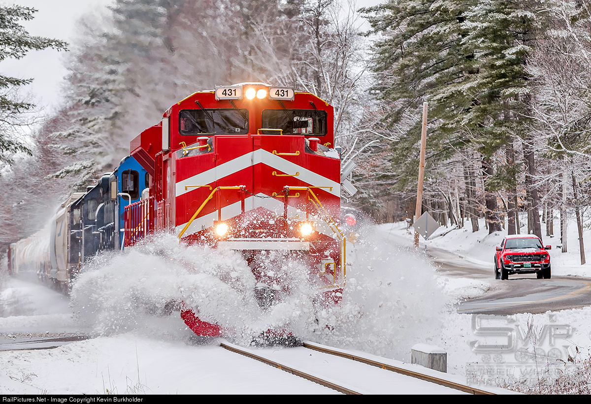 In the latest installment of GM vs. Ford, we ask who wears the red better, VTR SD70M-2 431 or the Ford Raptor that is approaching the grade crossing? On Wednesday, January 25, Vermont Rail System's Green Mountain Railroad train #263 is seen making light work of snow piles left by plows after the latest Nor'easter at Shrewsbury, VT with VTR SD70M-2 431 leading GMTX GP38-2 (ex-GP40) 2684, GMTX GP38-2 2205 and VTR GP38-2 202.