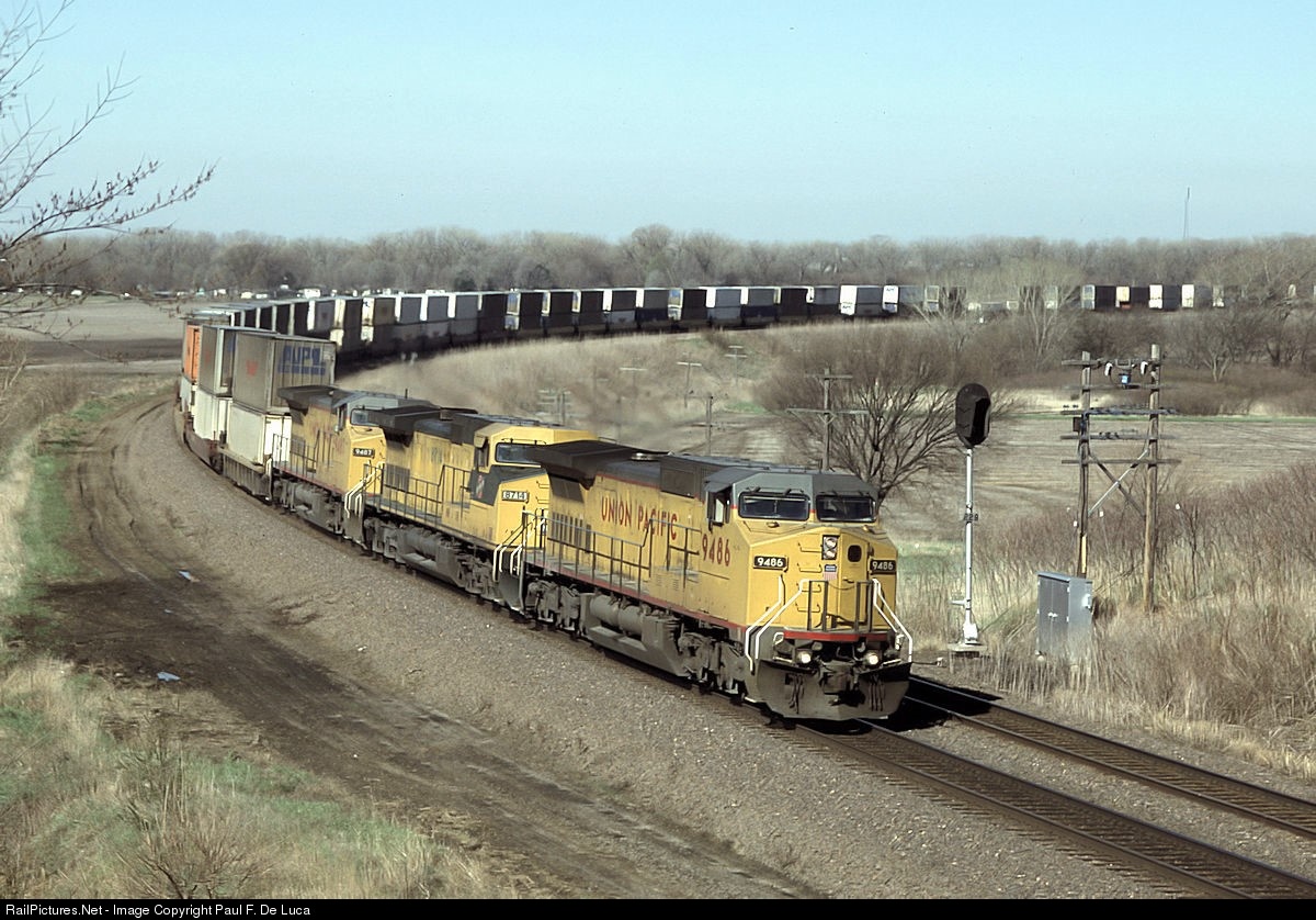 | An eastbound on Union Pacific's Council Bluffs Sub has just crossed the Elkhorn River and is climbing the short hill out of the Platte River valley. With the introduction of distributed power, most of these trains now operate on the C&NW's Blair Cutoff east of Fremont instead of on this route. |