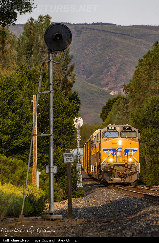 | UP 7691 leads the detouring MWCRV-17 into Santa Margarita and past the still active ex-Southern Pacific searchlights here as it prepares to take the siding for the detouring QRVWCB-16. These two trains, joined by another detouring West Colton - Roseville manifest later in the day, were forced off their normal route following the closure of Cajon Pass because of the massive Blue Cut Fire. |
