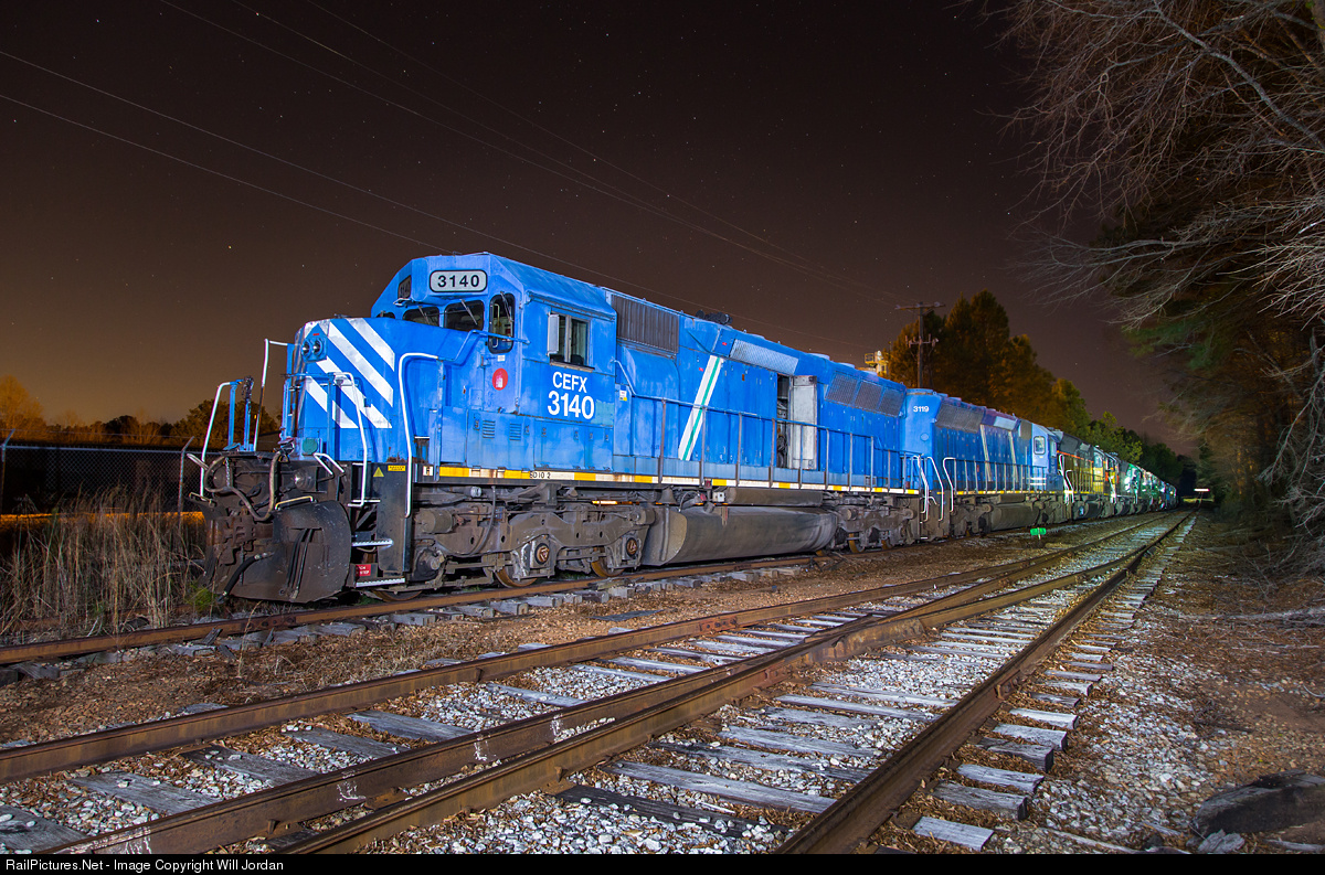 A string of ten locomotives sits restfully along the Great Walton's Social Circle Branchline, outside the PowerRail shop in Monroe, on a quiet night in Georgia.