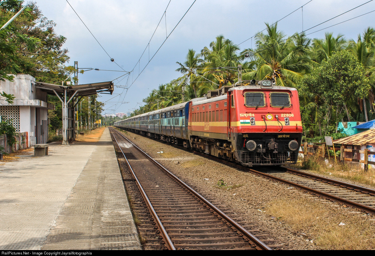 ROYAPURAM shed WAP-4 powering a late running Bengaluru City - Kanyakumari Express passing through Veli station